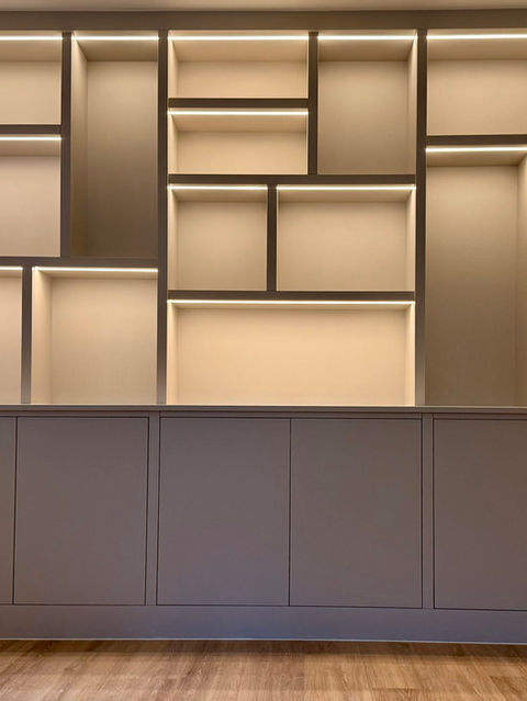 Custom bookshelves, bespoke media units, dressers - whether you need space for a record player, books, a large TV, or something more personal, we can design around exactly what you use and how you use it. Bookshelves, cupboards, cable management and lighting can all be built in from the start. We also build alcove shelving.